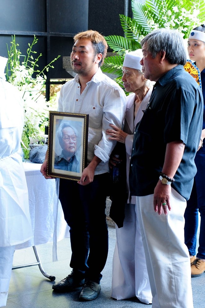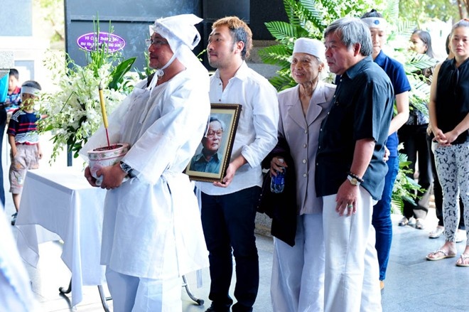 | Con trai cả của nhà văn Nguyễn Quang Sáng bưng bát hương còn đạo diễn Quang Dũng đỡ di ảnh của ông. Anh chia sẻ về sự ra đi đột ngột của cha trên trang cá nhân một cách đơn giản nhưng khiến không ít người xúc động: "Kết thúc một chặng đường. Ba tôi nhà văn Nguyễn Quang Sáng đã chia tay gia đình tôi. Ba đến nơi gặp những bạn bè thân, chú Trịnh Công Sơn, chú Bảo Phúc... Chúc ba vui vẻ nơi ấy! Má và các con yêu ba! Cám ơn thượng đế cho con được là con của ba". |