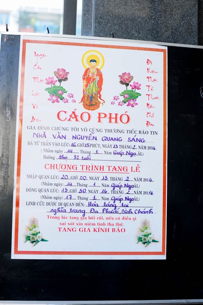 | Cáo phó của nhà văn Nguyễn Quang Sáng. Ngay sau những chia sẻ của Quang Dũng về những mất mát mà gia đình đang phải trải qua, rất nhiều người đã nhắn tin chia buồn và động viên cũng như tỏ ý mong anh em anh và mẹ sớm vượt qua nỗi đau mất mát. |