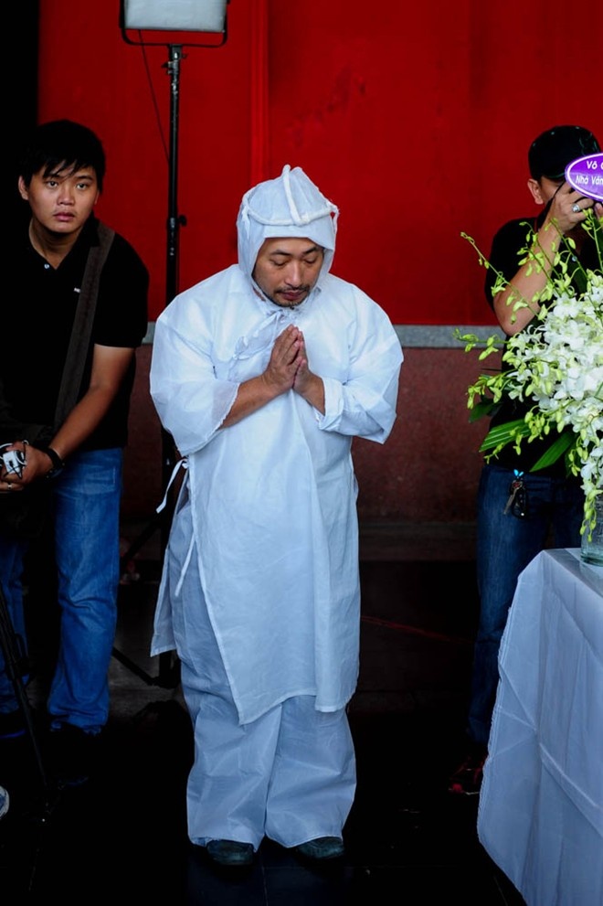 | Đạo diễn Nguyễn Quang Dũng chắp tay, cúi đầu lễ tạ những người tới viếng từ sớm. |
