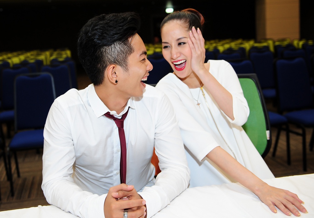 | Trước ống kính, hai người không ngại dành cho nhau cái nhìn tình cảm. Gần đây họ thoải mái xuất hiện trong các sự kiện, bỏ mặc những dư luận trái chiều về cuộc tình cô trò kém 12 tuổi. Phan Hiển cũng công khai chăm sóc bà bầu chốn đông người. |