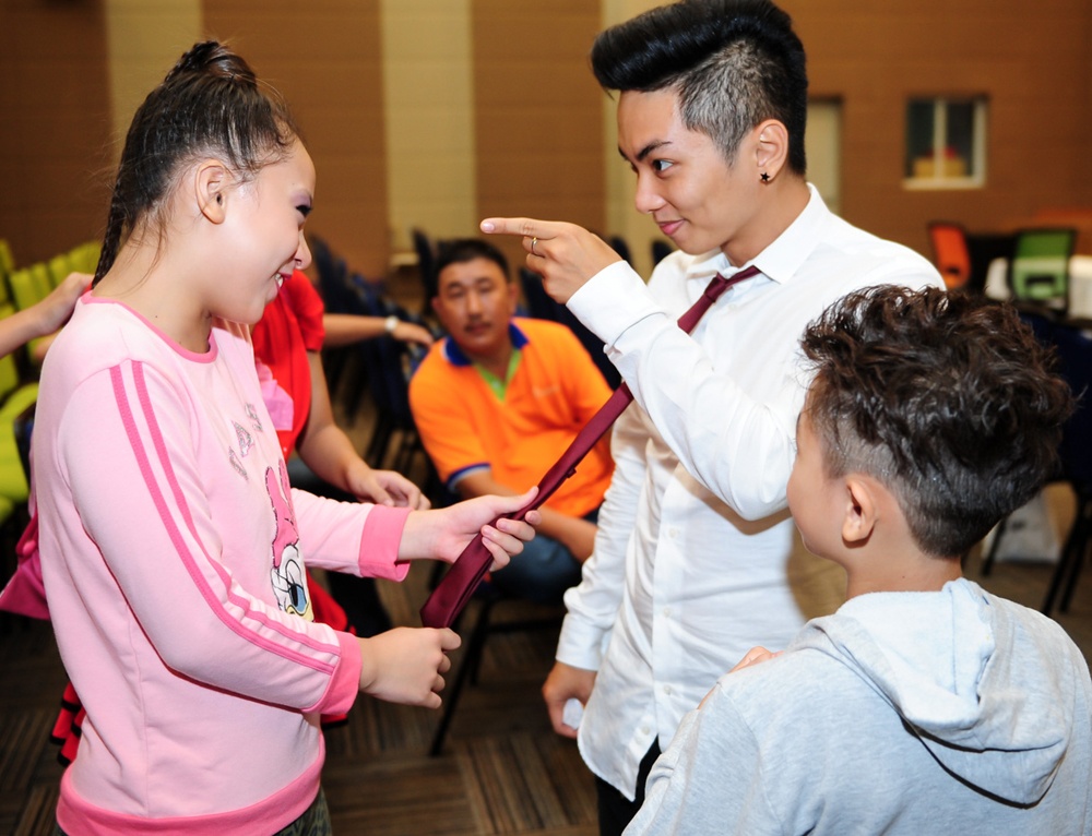 | Kiện tướng 22 tuổi trêu đùa các thí sinh nhí. Ngoài đời, Phan Hiển dễ gần, vui tính nhưng trước đám đông, anh thường kiệm lời, e dè. |