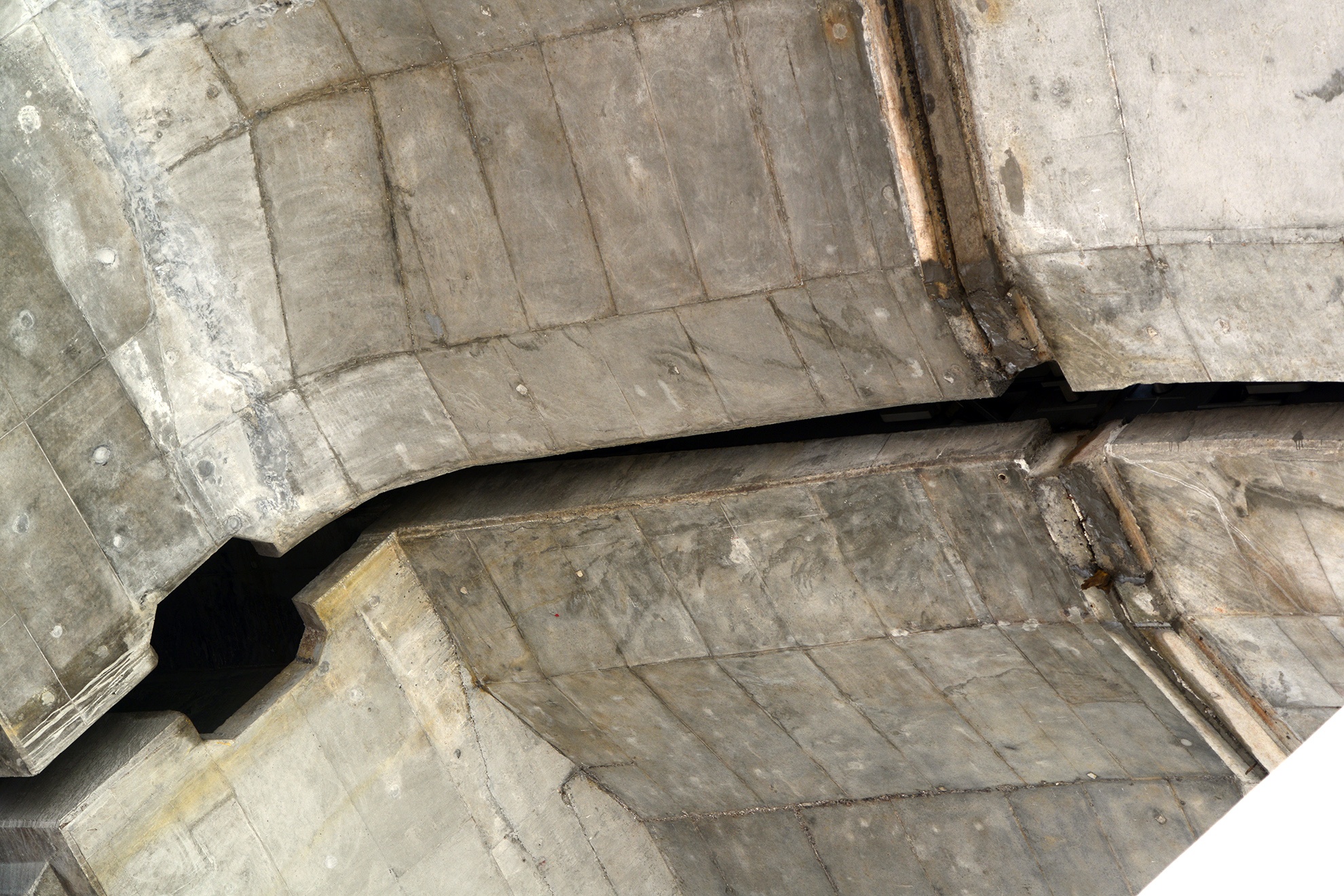 | Từ phía dưới gầm cầu nhìn ngược lên, khe hở lộ rõ thành một đường dài hơn 30 m chạy ngang. |