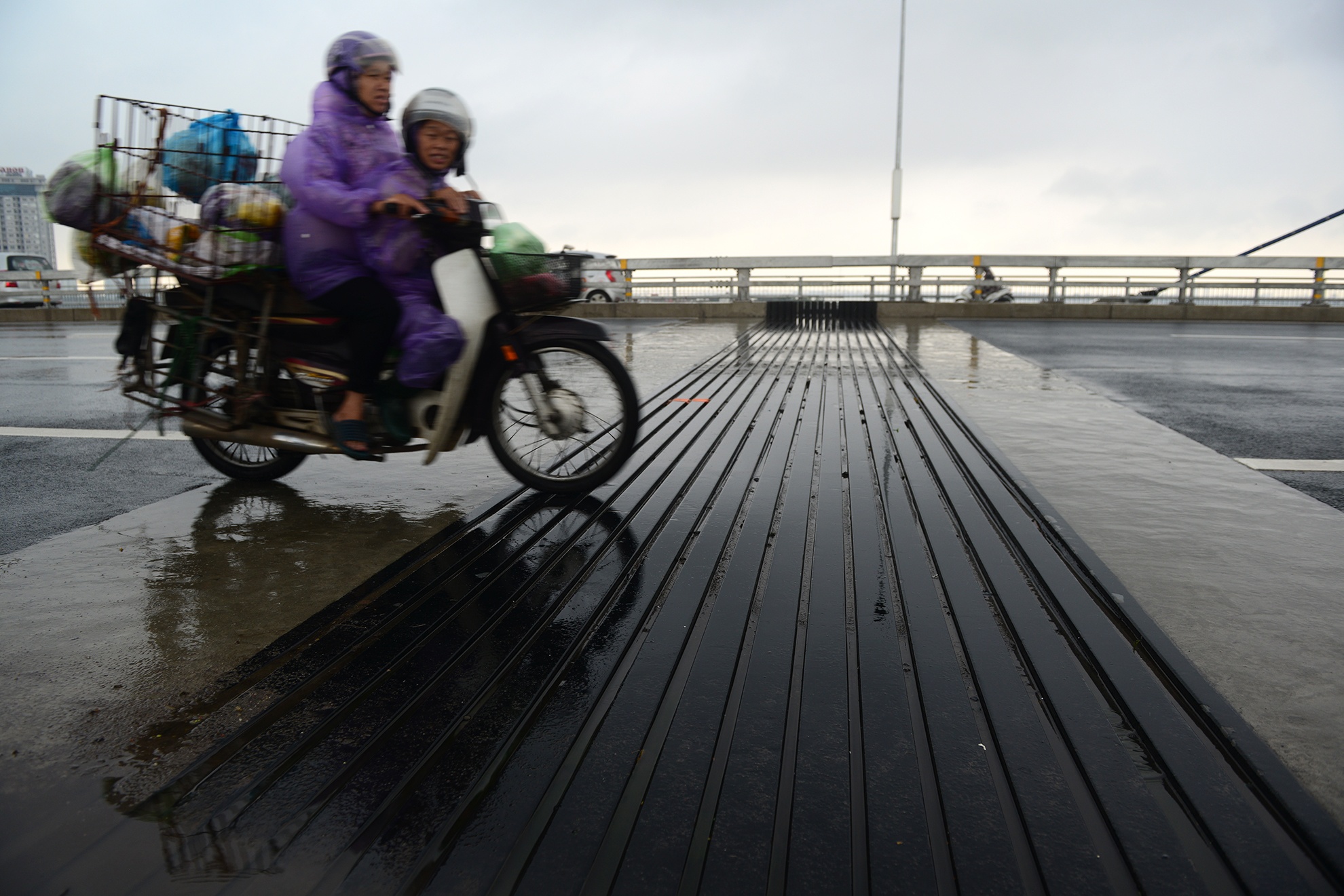 "Thanh thép mà chúng ta nhìn thấy là kết cấu để đỡ bánh xe khi đi qua các khoảng hở lớn – sử dụng dạng kết cấu khe co giãn. Khe co giãn có kích thước thay đổi phụ thuộc vào khoảng hở của các kết cấu. Đối với cầu Nhật Tân, phần nhịp chính là kết cấu lớn có độ co giãn nhiệt dài nên kết cấu khe co giãn lớn và tương đối phức tạp. Trong thiết kế của cầu Nhật Tân ở 24 độ C, khe hở là 75 cm, khe co giãn có bề rộng lớn hơn khe hở. Đối với nhiệt độ tối đa của Hà Nội trên bề mặt bê tông. Khi thiết kế, chúng tôi đã có biểu đồ nhiệt để đảm bảo cầu hoạt động an toàn. Ngoài ra, cầu Nhật Tân là cầu dây văng liên tục nhiều nhịp có 5 trụ tháp. Tổng chiều dài liên nhịp là 1500 m nên khe co giãn sẽ to hơn khe co giãn của cầu khác", ông Minh nói.