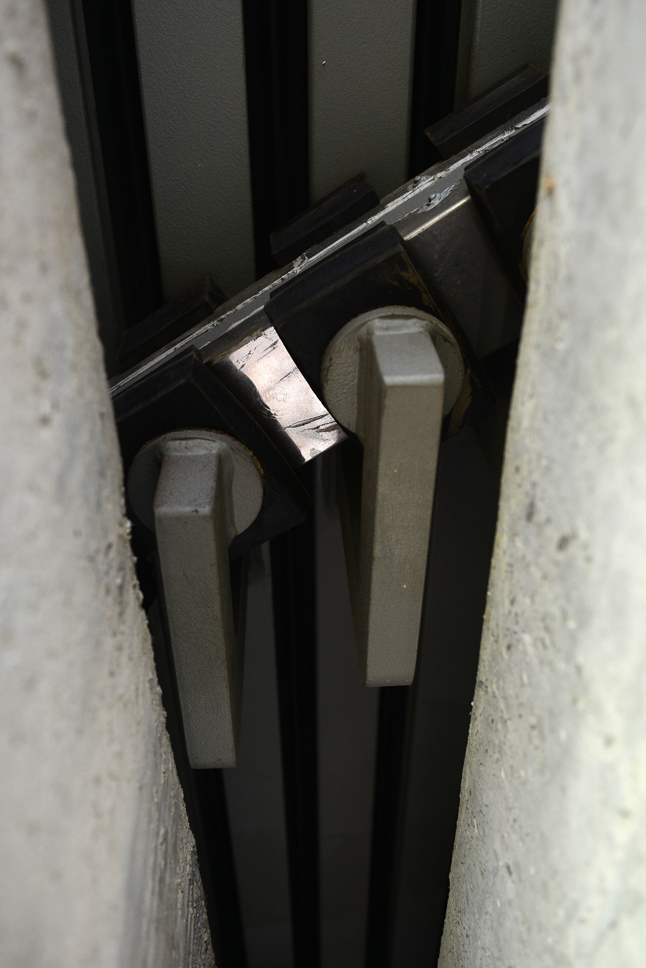 | Nhìn từ mặt ngược lại, khe hở rộng vừa cho một người đi lại trên mặt trụ. Tại điểm nối này còn có một hệ thống giàn giáo nối từ mặt đất ở gầm lên tới thành cầu và được bảo vệ bởi lưới an toàn và các vòng đai tròn quanh thang sắt. |