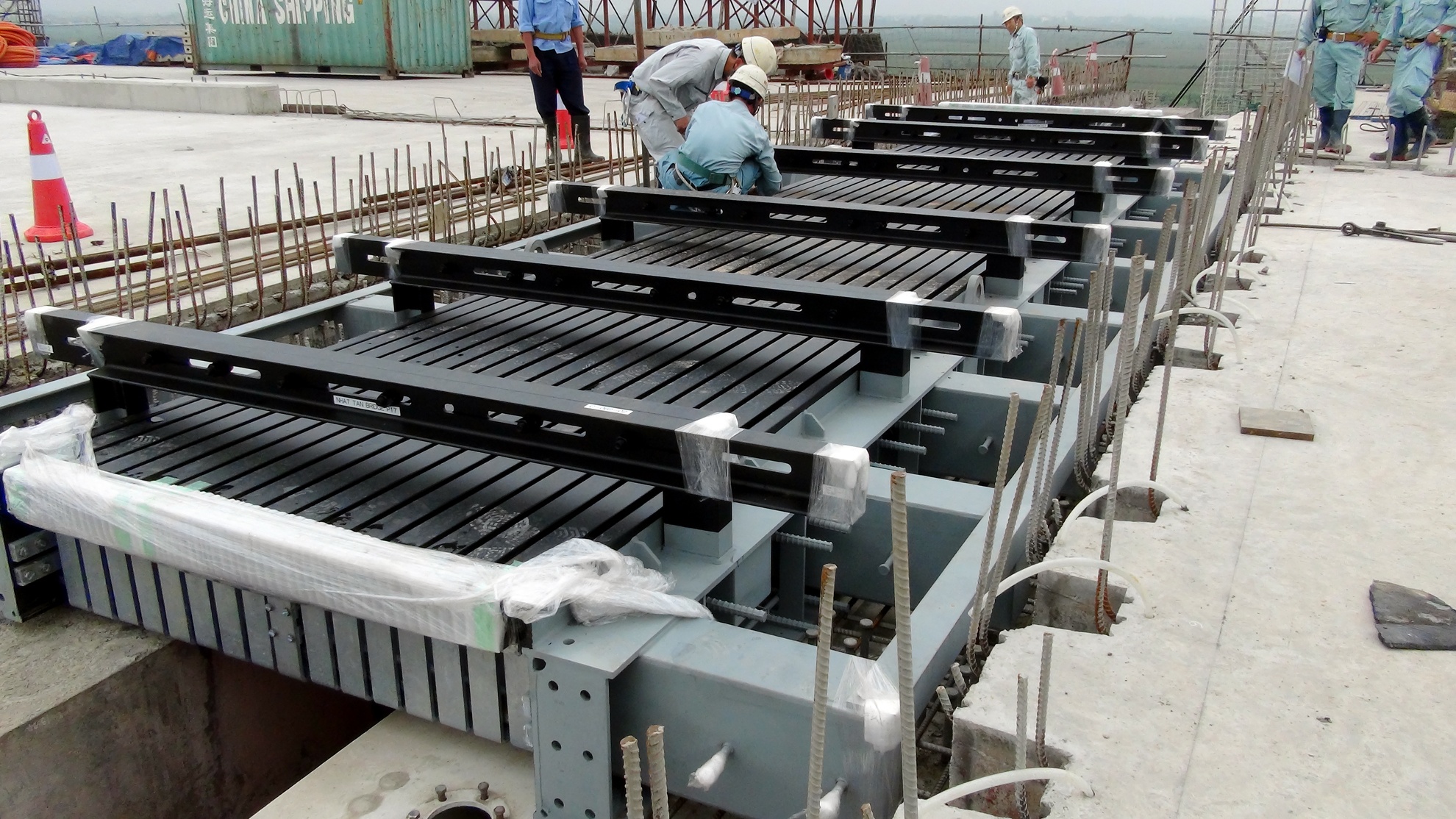 Hình ảnh thời điểm thi công lắp đặt khe co giãn giữa các phiến dầm cầu Nhật Tân. Ảnh: BQL dự án cầu Nhật Tân cung cấp.
