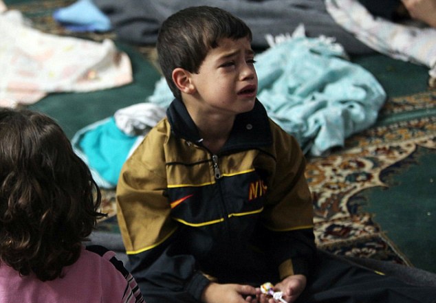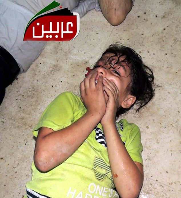 Vẻ hãi hùng vẫn còn hiện hữu trên mặt em bé sống sót sau vụ tấn công bằng khí độc thần kinh. Ảnh AP. |