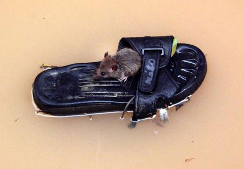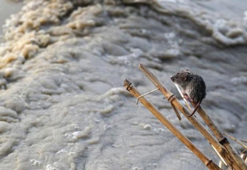 | Chuột nhỏ bám chặt vào cành cây để không bị dòng lũ sông Yamuna (Ấn Độ) cuốn trôi. |