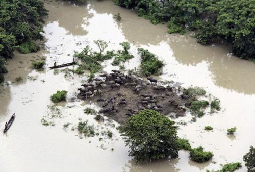| Đàn trâu bị cô lập giữa bốn bề nước lũ tại Ấn Độ. |
