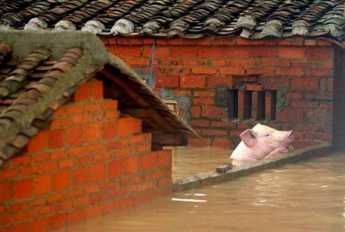 | Lợn bám vào tường để không bị ngạt nước ở Quảng Đông, Trung Quốc. |