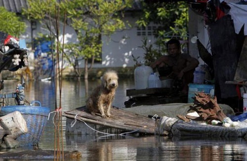 | Hai chú chó “ngán ngẩm” cảnh nước ngập tại thủ đô Bangkok, Thái Lan. |