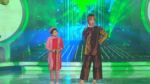 | Hoài Linh một lần nữa đưa con nuôi lên sân khấu khi làm giám khảo chương trình Gương mặt thân quen nhí. Trong đêm diễn mở màn, anh và bé Ben (tên thật là Nguyễn Hồng Quân) trình diễn ca khúc Thằng Bờm. |