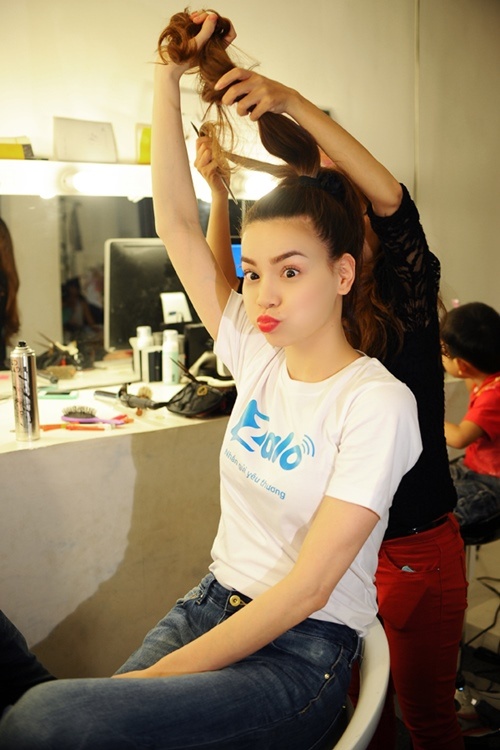 Người đẹp xì-tin, nhí nhảnh ngay cả trong hậu trường, khi đang được các chuyên gia chăm lo cho vẻ bề ngoài.