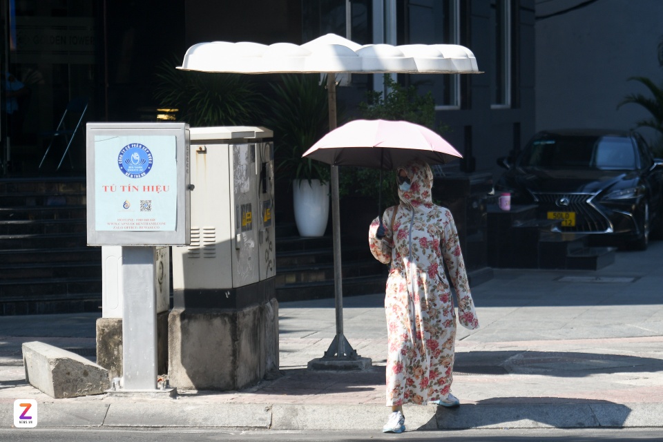 Một người đi bộ mặc đồ chống nắng kín người và cầm theo ô để đi bộ trên vỉa hè đường Nguyễn Thị Minh Khai (phường Sài Gòn). Ảnh: Duy Hiệu. |