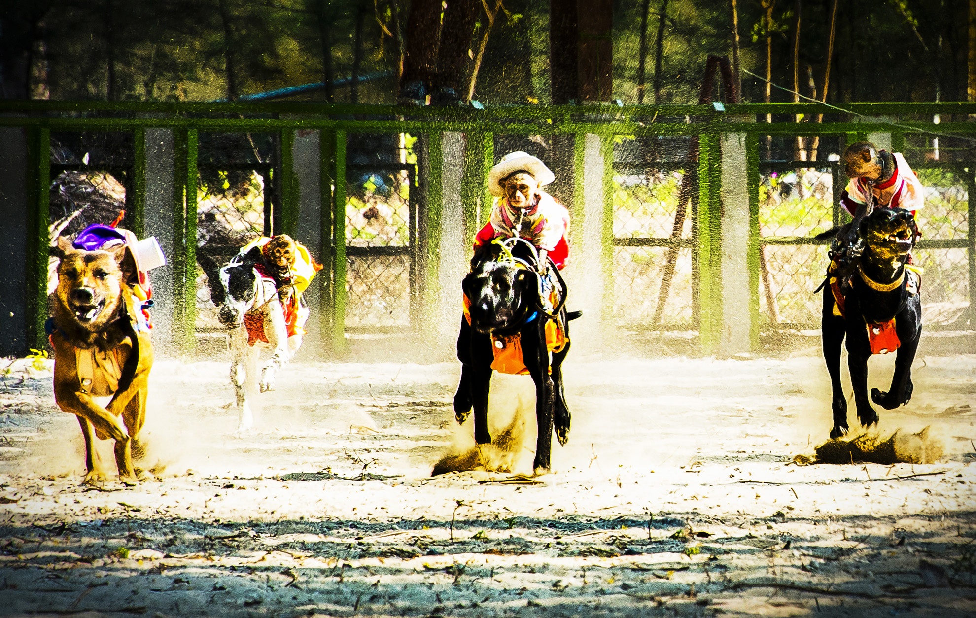 | 8 chú khỉ đu mình trên những chú chó to, khỏe phóng nhanh trên đường đua. |