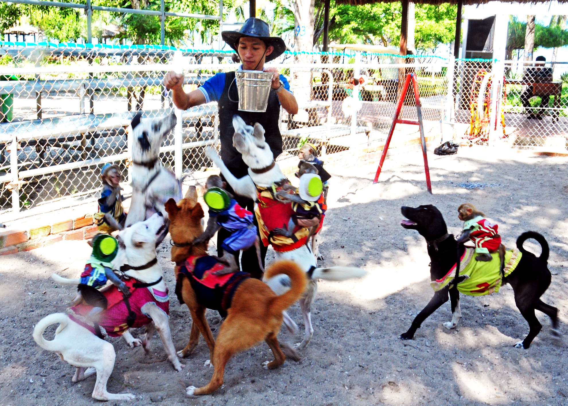 Màn trình diễn khỉ đua chó là một show diễn độc đáo, hút du khách khi đến tham quan thành phố biển Nha Trang (Khánh Hoà).