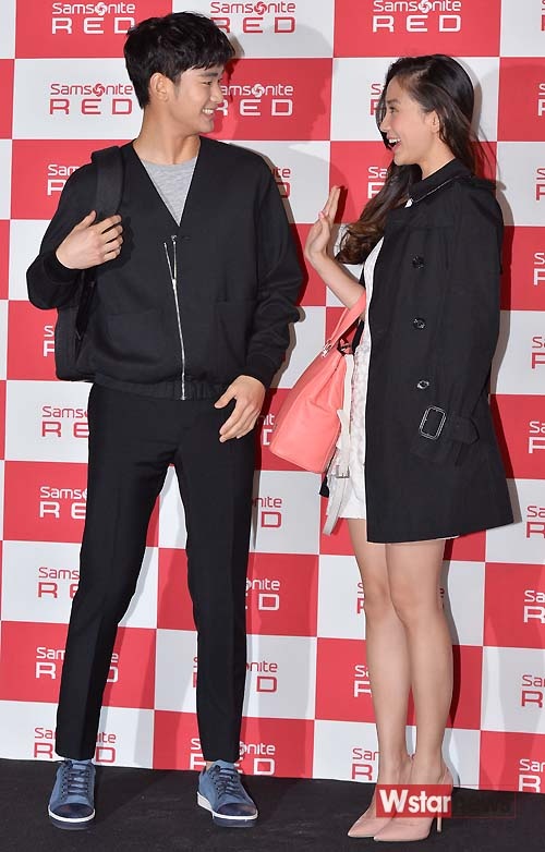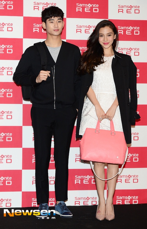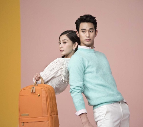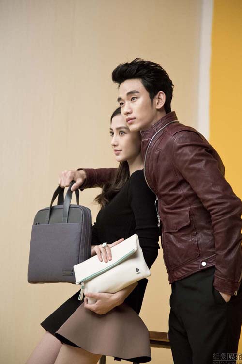 | Angela Baby và Kim Soo Huyn tình tứ bên nhau khi chụp hình cho bộ ảnh quảng cáo sản phẩm mới của hãng túi thời trang Samsonite Red. |
