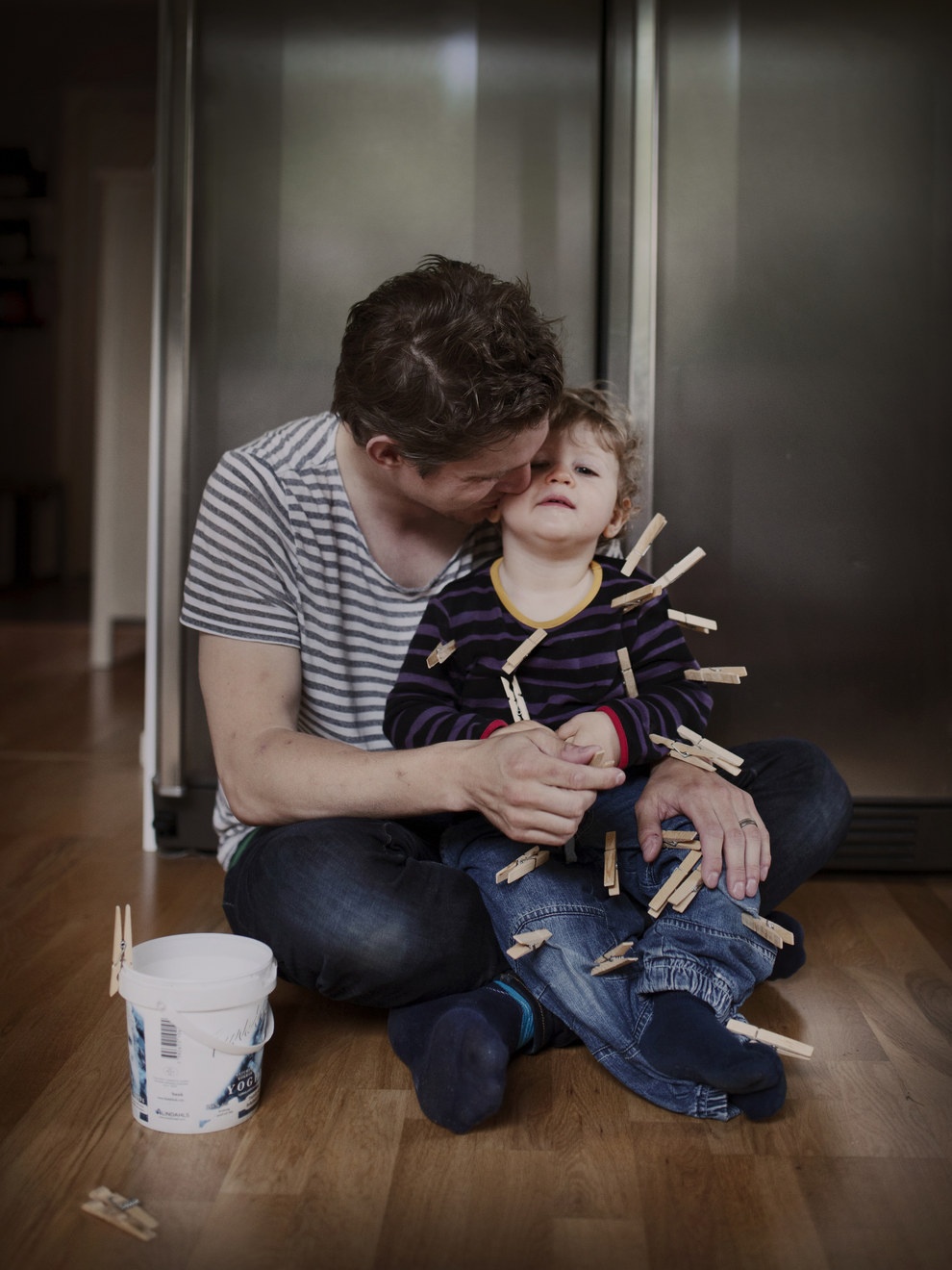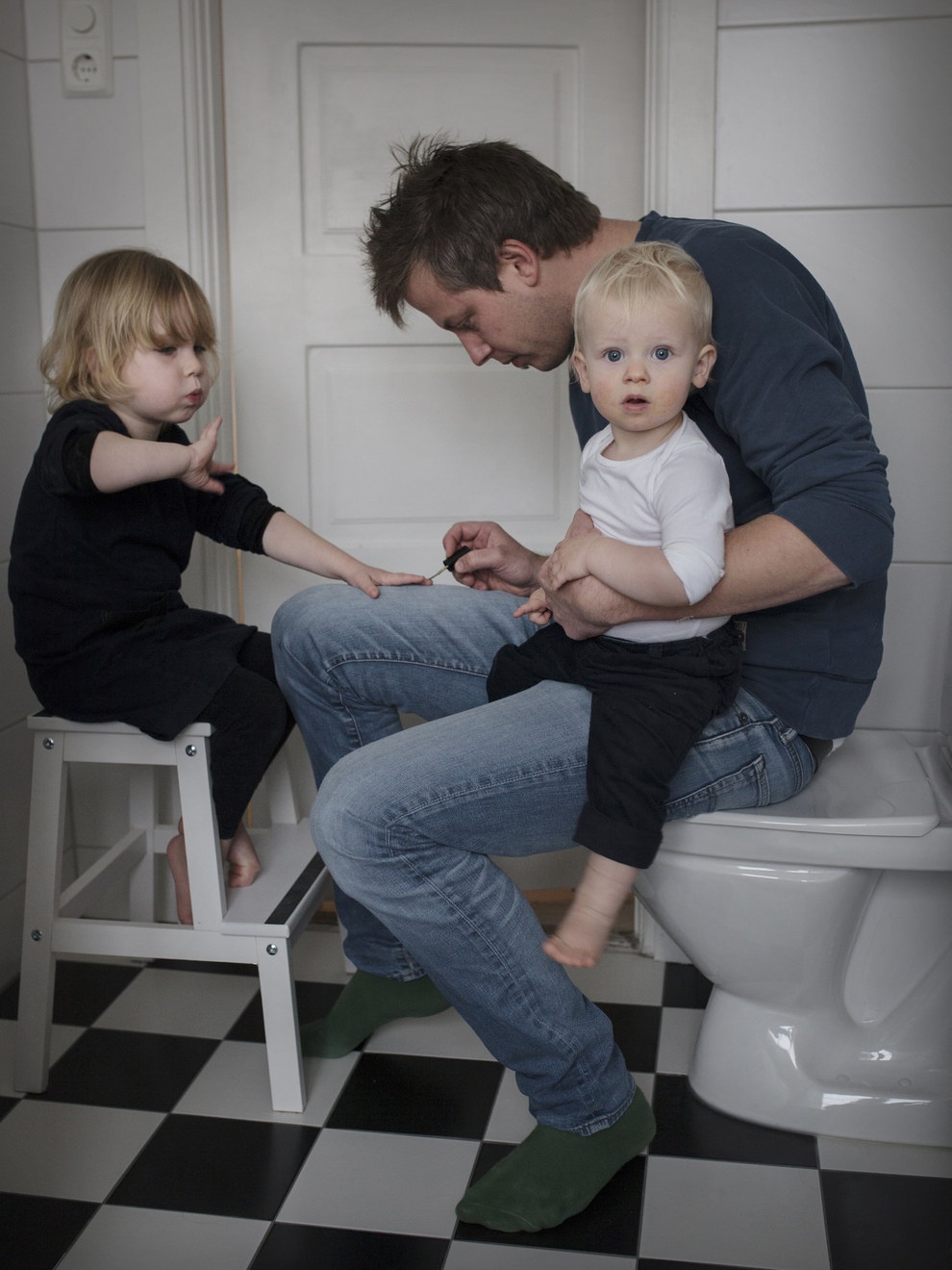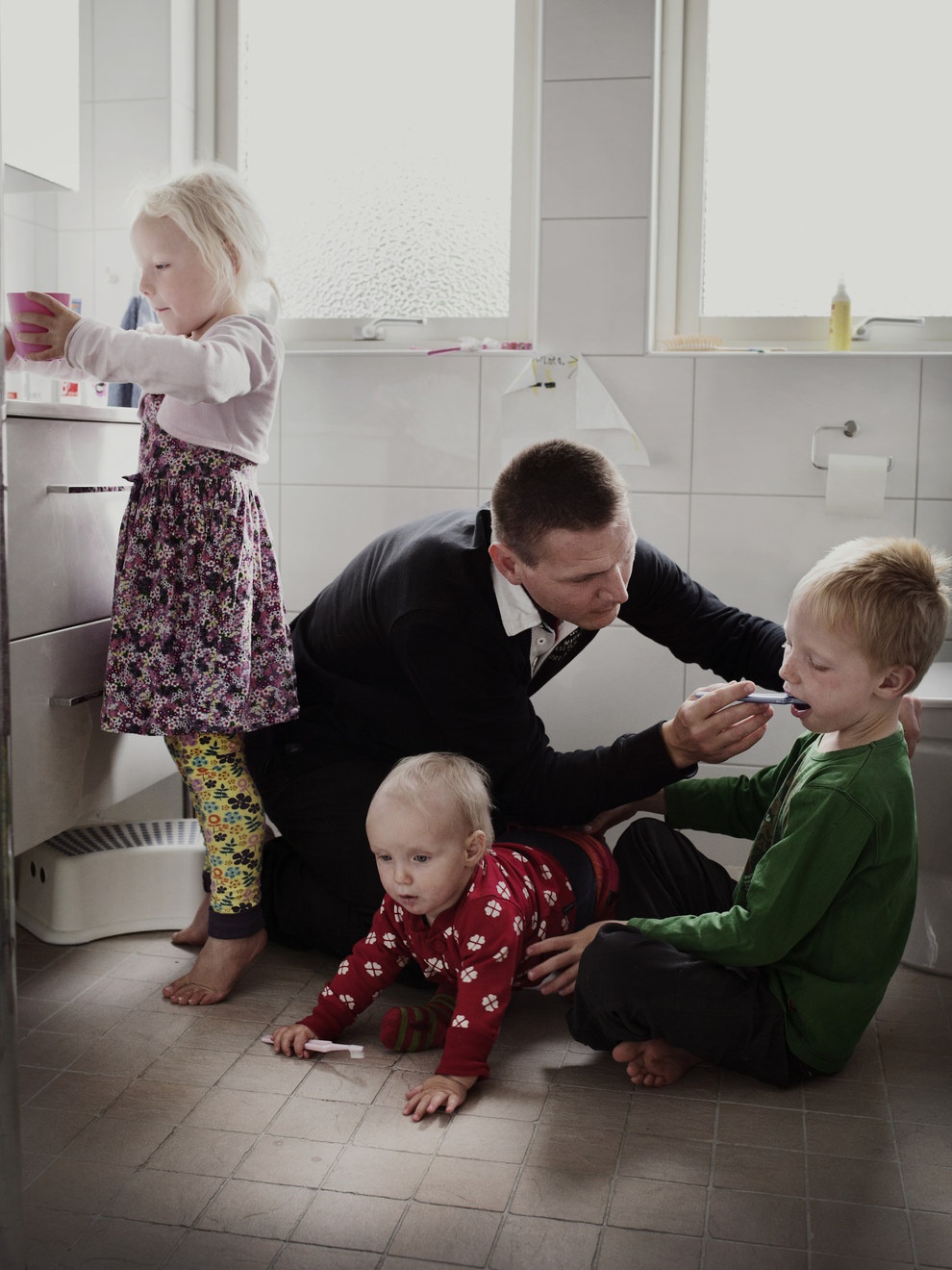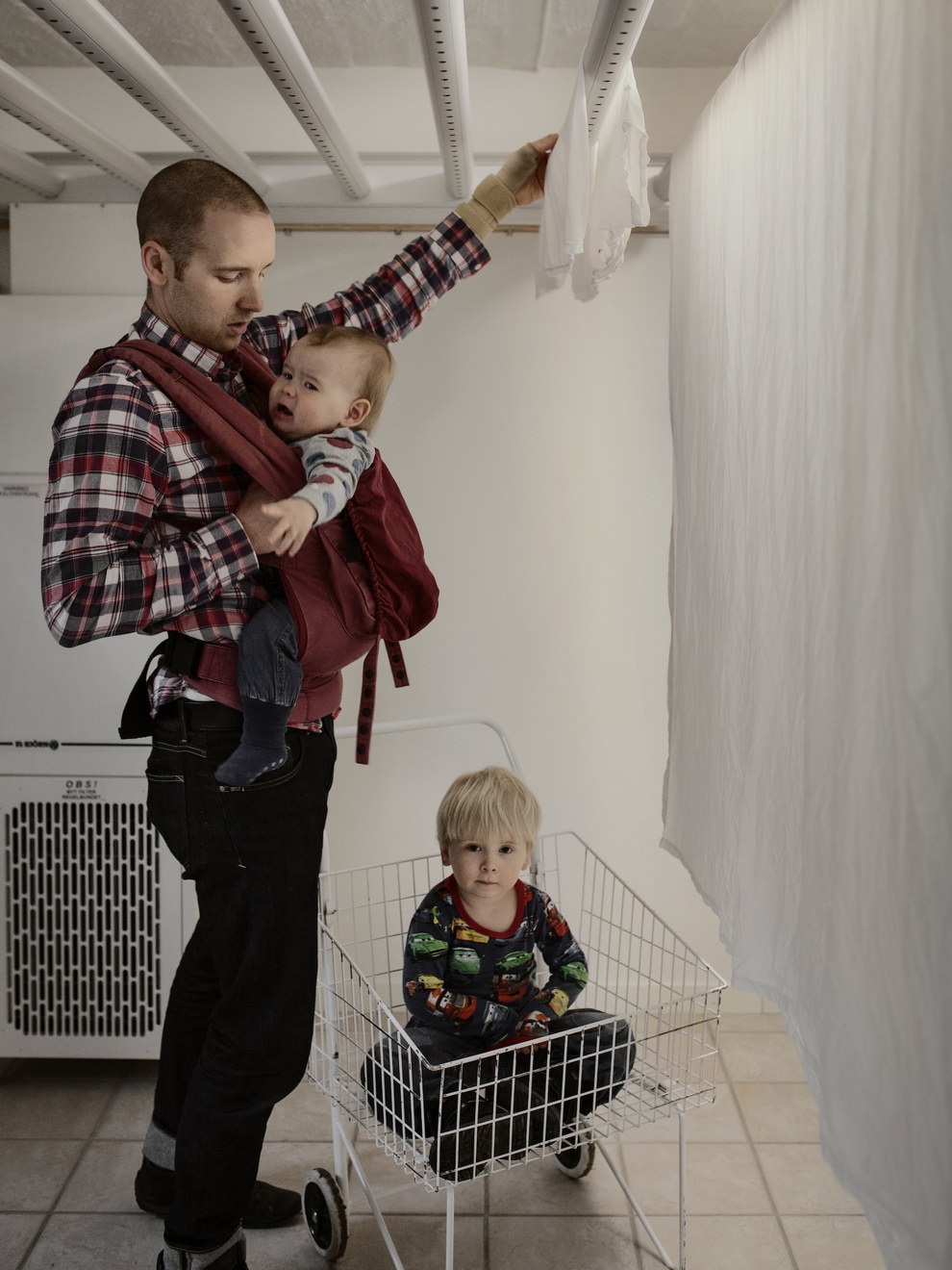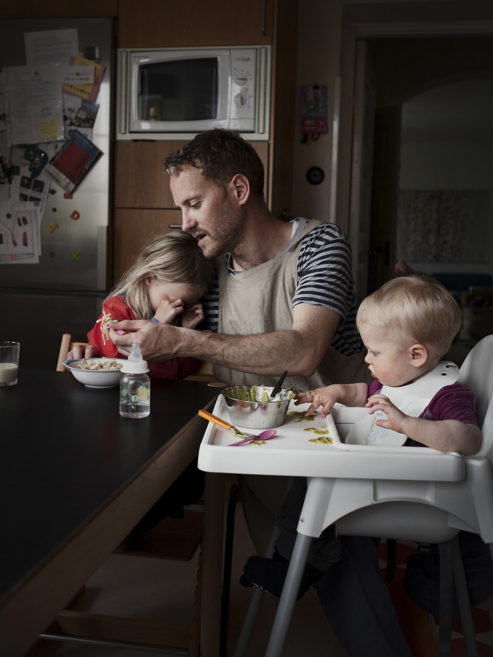 Nhiếp ảnh gia Johan Bavman ghi lại khoảnh khắc những ông bố trên khắp Thụy Điển ở nhà cùng con, tất bật và đảm đang không kém gì những người mẹ. Johan Ekengard (ảnh), người phát triển sản phẩm tại công ty Sandvik, cho biết anh và vợ chia sẻ thời gian chăm sóc các con Ebbe, 7 tuổi, Tyra, 5 tuổi, và Stina, 1 tuổi. "Nghỉ việc trong một thời gian dài đồng nghĩa với việc gia đình sẽ mất một khoản thu nhập. Tuy nhiên, đối với tôi, việc này vô cùng đáng giá. Tôi có thể làm tròn trách nhiệm của một người cha, đồng thời chia sẻ những khó khăn với vợ. Chúng tôi ngày càng gắn bó hơn", người đàn ông 38 tuổi nói.