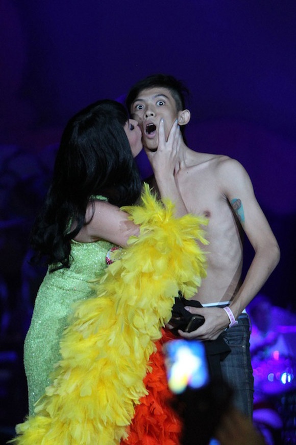 Katy Perry luôn nổi hứng hôn lên má fan bất ngờ. Cánh báo giới có không ít những hình ảnh hot khi cô nàng đột ngột hôn người hâm mộ trong tiết mục biểu diễn. Bản thân những người trong cuộc được hôn cũng thường khó giấu được cảm xúc choáng váng.