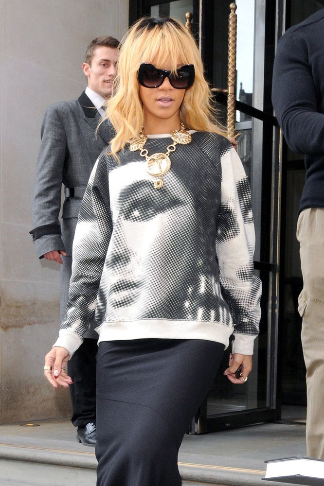 | Nếu như ở ảnh trên, Rihanna là một cô nàng quyến rũ với hình ảnh Elizabeth Taylor thì ở đây, cô ca sĩ Barbados lại đầy nổi loạn với áo Kate Moss và quần siêu ngắn. |