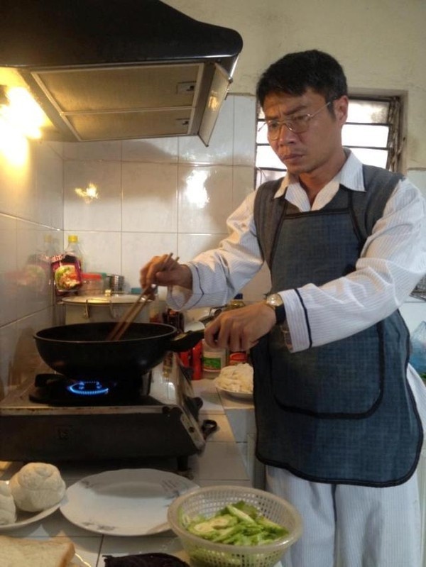 | Trái ngược với sự hài hước trên sân khấu hay các bộ phim, hình ảnh diễn viên Quang Thắng trong bếp vô cùng giản dị. |