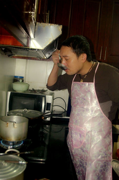 | Chiến Thắng đeo tạp dề, nếm thử món ăn rất ra dáng ông bố đảm đang. |