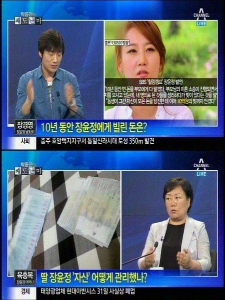 | "Nữ hoàng quảng cáo" Jang Yoon Jung và mẹ ruột cũng khiến làng giải trí chấn động khi lời qua tiếng lại tố cáo nhau. Jang Yoon Jung tố mẹ và em trai đã phung phí công sức của cô và còn để lại khoản nợ lên đến gần 20 tỉ đồng, khiến cô mệt mỏi. |