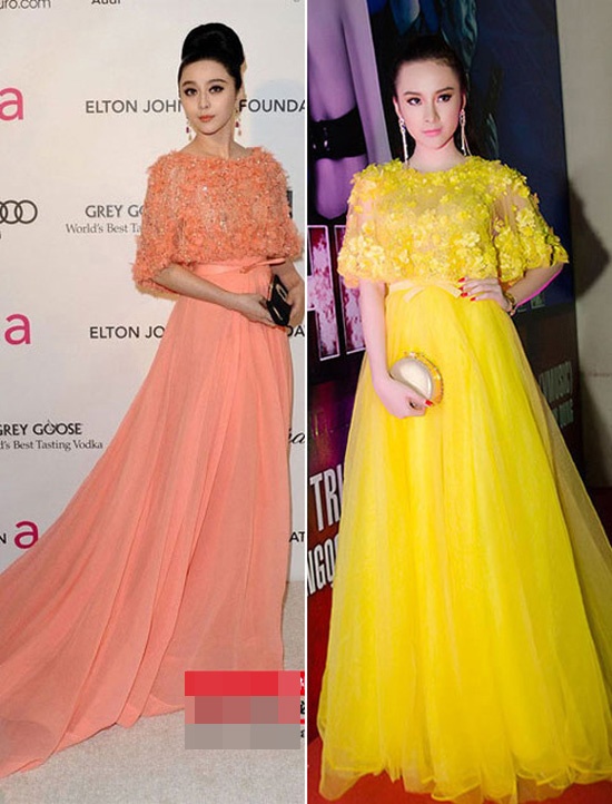 | Bộ váy gốc của Phạm Băng Băng là từ thương hiệu Elie Saab, bộ váy của Angela Phương Trinh là hàng nhái, chỉ khác hoa văn và màu sắc. |