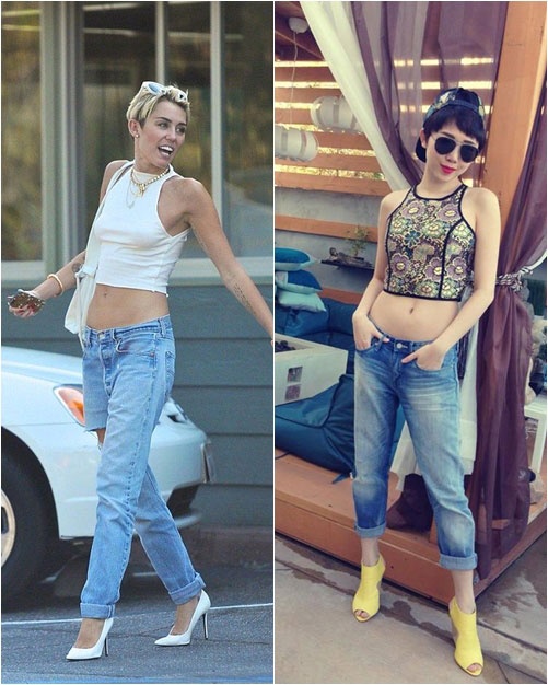 | Sự giống nhau không hề nhỏ trong trang phục dạo phố của Tóc Tiên và Miley Cyrus. |