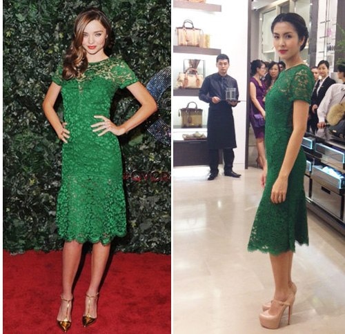 | Tăng Thanh Hà đụng hàng với Miranda Kerr trong bộ váy màu xanh ngọc lục bảo của Burberry, tuy nhiên nếu Hà Tăng kết hợp với một đôi giầy khác thanh mảnh hơn thì sẽ đẹp hơn nữa. |