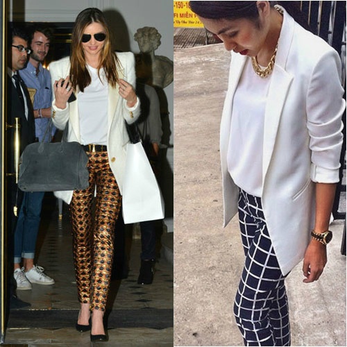 | Cả hai người đẹp đều rất sành điệu với cách kết hợp áo blazer và sơ mi trắng cùng quần mang họa tiết hình học. |