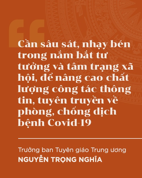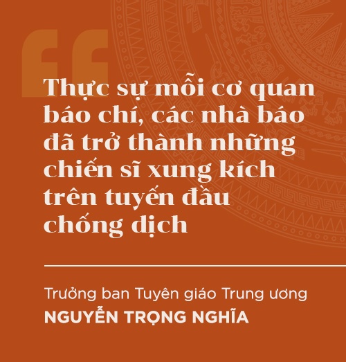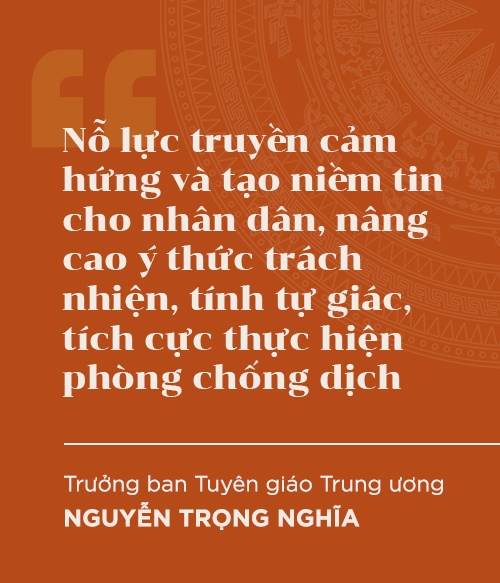 Bên cạnh việc ban hành hướng dẫn, Ban Tuyên giáo Trung ương phối hợp chặt chẽ với Ban Chỉ đạo quốc gia về phòng, chống dịch Covid-19, với Bộ Thông tin và Truyền thông, Hội Nhà báo Việt Nam, thường xuyên, liên tục, chủ động, sâu sát trong chỉ đạo, định hướng các cơ quan báo chí, truyền thông mở đợt cao điểm, đặt chuyên trang, chuyên mục, thành lập nhóm phóng viên chuyên trách tuyên truyền về phòng, chống dịch bệnh. Và thực sự mỗi cơ quan báo chí, các nhà báo đã trở thành những chiến sĩ xung kích trên tuyến đầu chống dịch, qua đó góp phần nâng cao nhận thức, củng cố niềm tin của nhân dân vào sự lãnh đạo của Đảng, Nhà nước, chung sức đồng lòng, tích cực tham gia và tạo nên những kết quả quan trọng rất đáng khích lệ trong công tác phòng, chống dịch Covid-19.