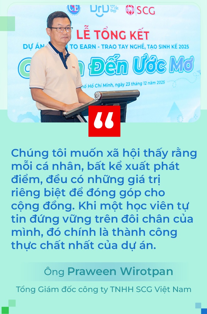 “Ý nghĩa lớn nhất của ‘Learn to Earn’ chính là sự chuyển dịch từ việc hỗ trợ ngắn hạn sang đào tạo nghề và hành trình khơi dậy tiềm năng và xây dựng niềm tin cho người khuyết tật. Chúng tôi muốn xã hội thấy rằng mỗi cá nhân, bất kể xuất phát điểm, đều có những giá trị riêng biệt để đóng góp cho cộng đồng. Khi một học viên tự tin đứng vững trên đôi chân của mình, đó chính là thành công thực chất nhất của dự án”, ông Praween Wirotpan - Tổng Giám đốc công ty TNHH SCG Việt Nam nhấn mạnh.