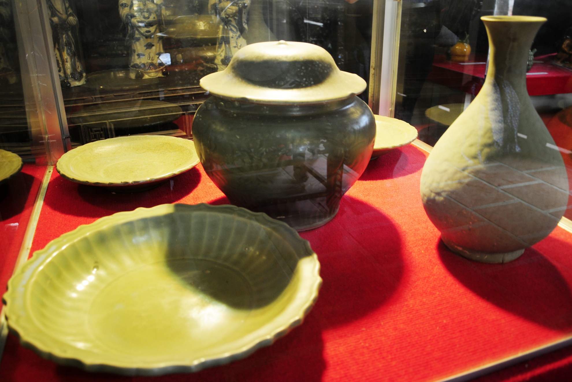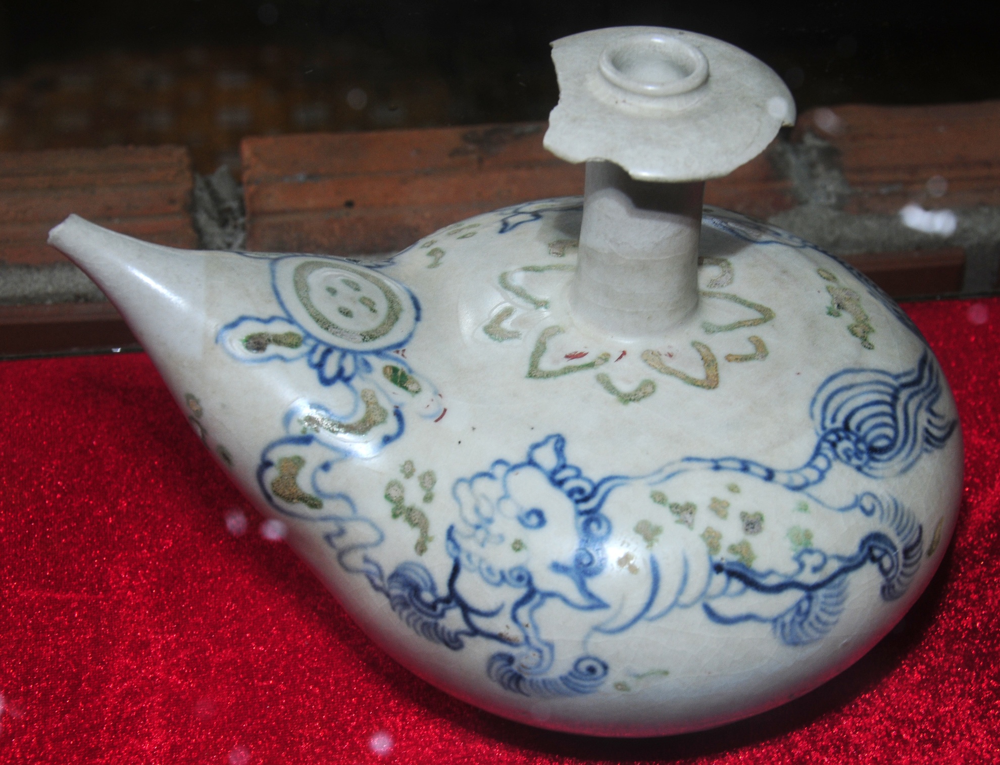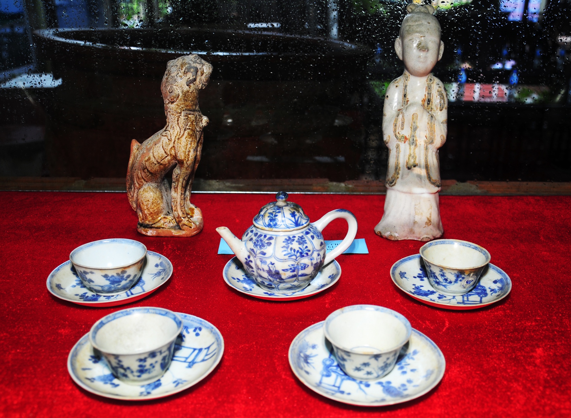 | Bộ sưu tập ấm chén (niên đại thế kỷ 17) được tìm thấy trong tàu cổ đắm ở vùng biển Cà Mau. Bên cạnh là tượng nghê, tượng "cô gái quý tộc" mang biểu tượng thiếu nữ họ Bùi ở làng gốm Chu Đậu (Hải Dương, niên đại thế kỷ 15) được tìm thấy trong con tàu đắm ở vùng biển Cù Lao Chàm (TP Hội An, tỉnh Quảng Nam). |