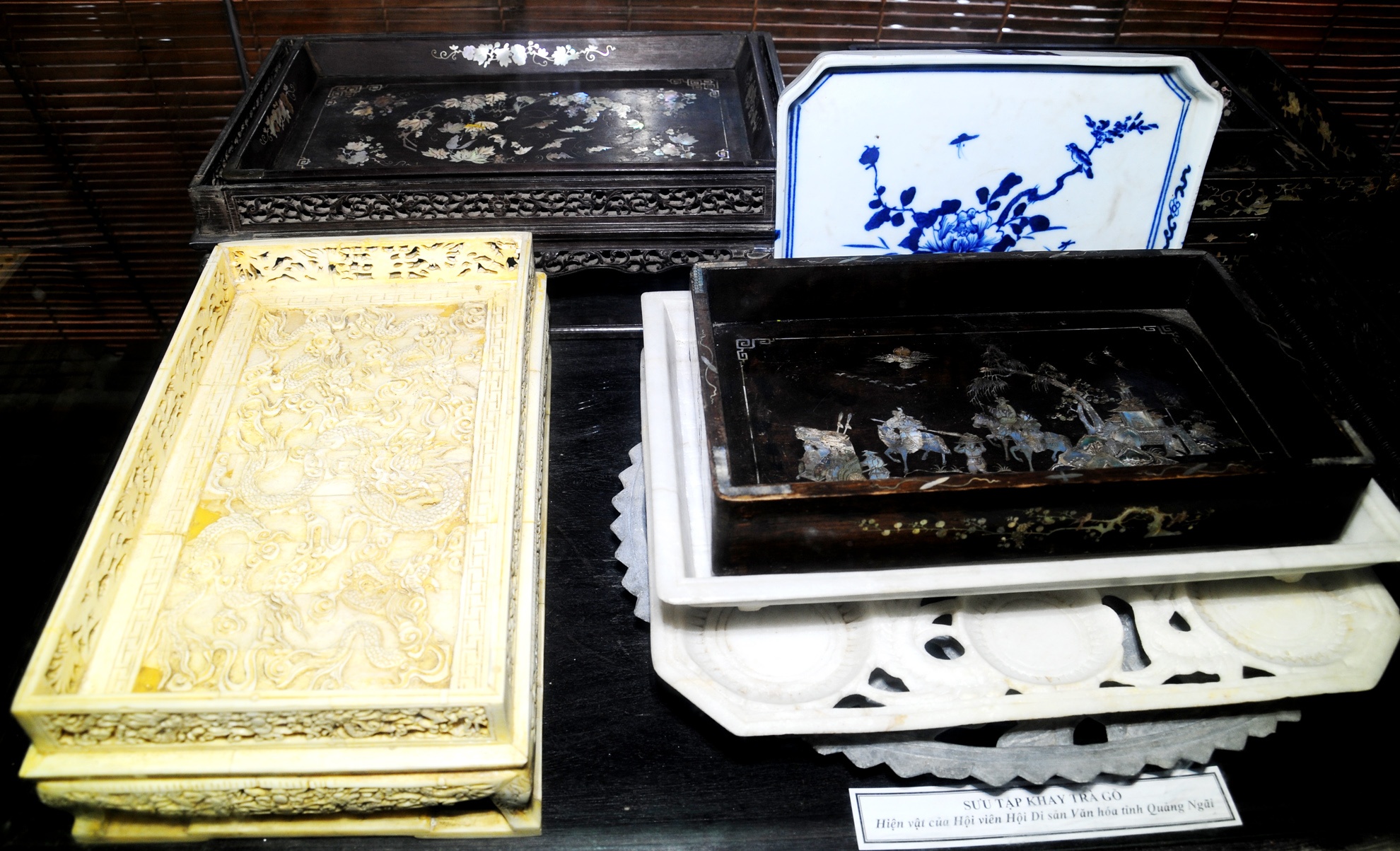 | Bên cạnh các hiện vật gốm tìm thấy ở các vùng biển Việt Nam, Hội Di sản Văn hóa Quảng Ngãi còn trưng bày bộ sưu tập khay trà gỗ chạm khắc tinh xảo theo điển tích cổ xưa. |