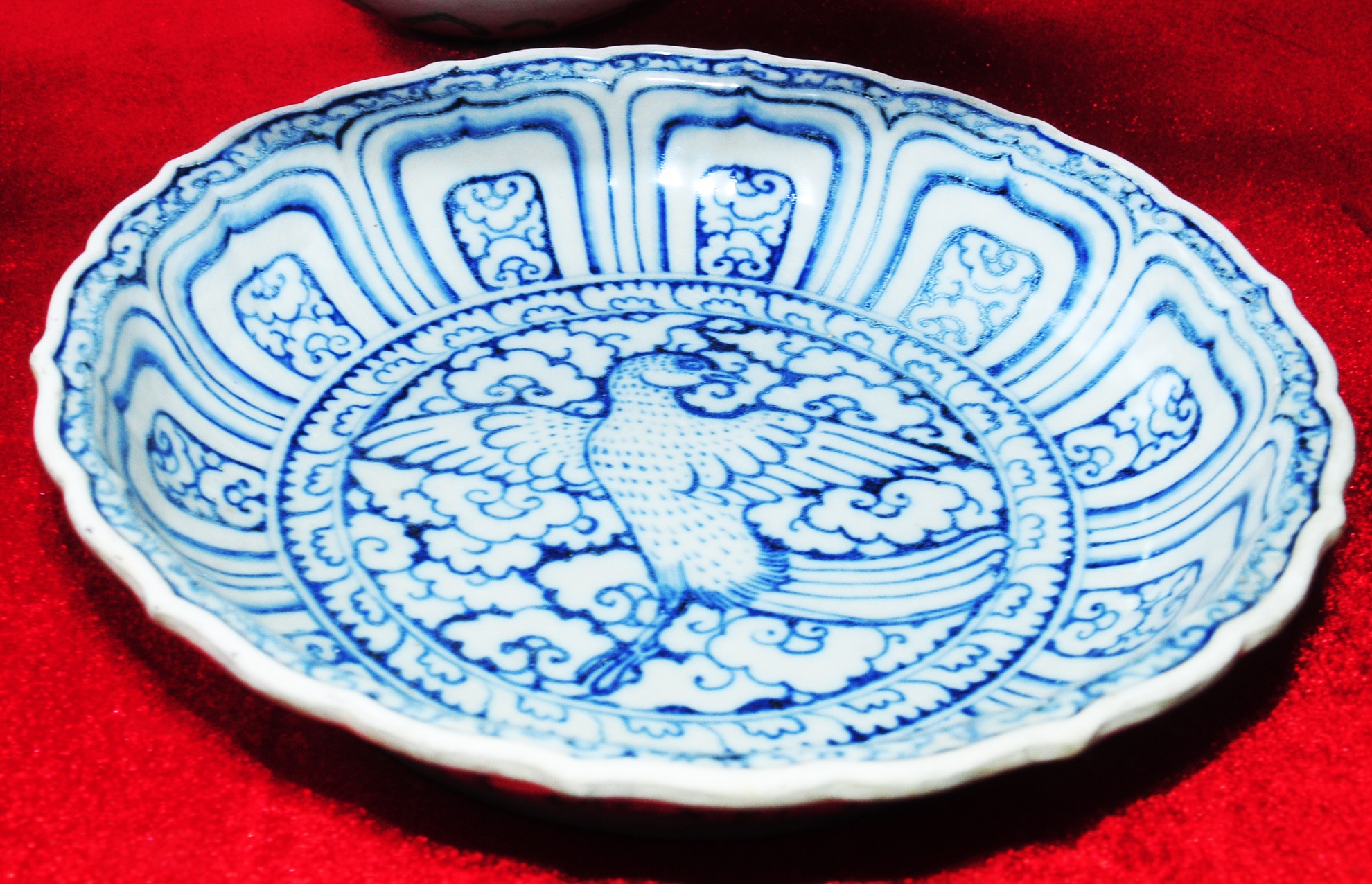 | Đĩa gốm có họa tiết chim bay màu xanh trắng tinh xảo. Theo Ban tổ chức, việc trưng bày cổ vật gốm sứ khai quật từ các con tàu chìm nhằm gửi đi thông điệp rộng rãi đến du khách về con đường "gốm sứ" trên biển, về chủ quyền biển đảo thiêng liêng của Việt Nam. |