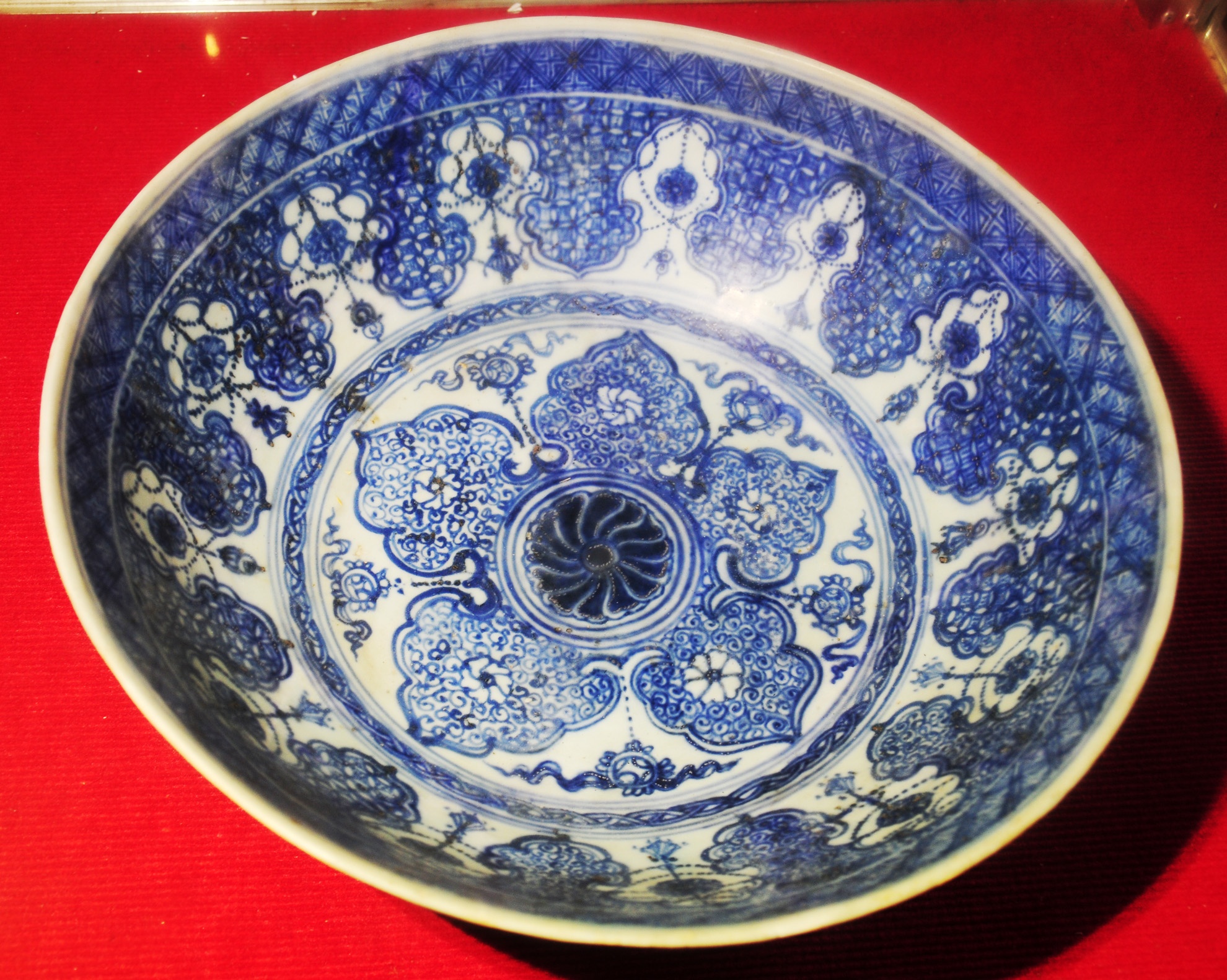 | Tô sứ trắng hoa lam quý hiếm có đường kính 42 cm, bên trong trang trí hoa 5 cánh, xung quanh họa tiết hoa cúc dây (niên đại thế kỷ 15) được tìm thấy ở vùng biển Kiên Giang. |
