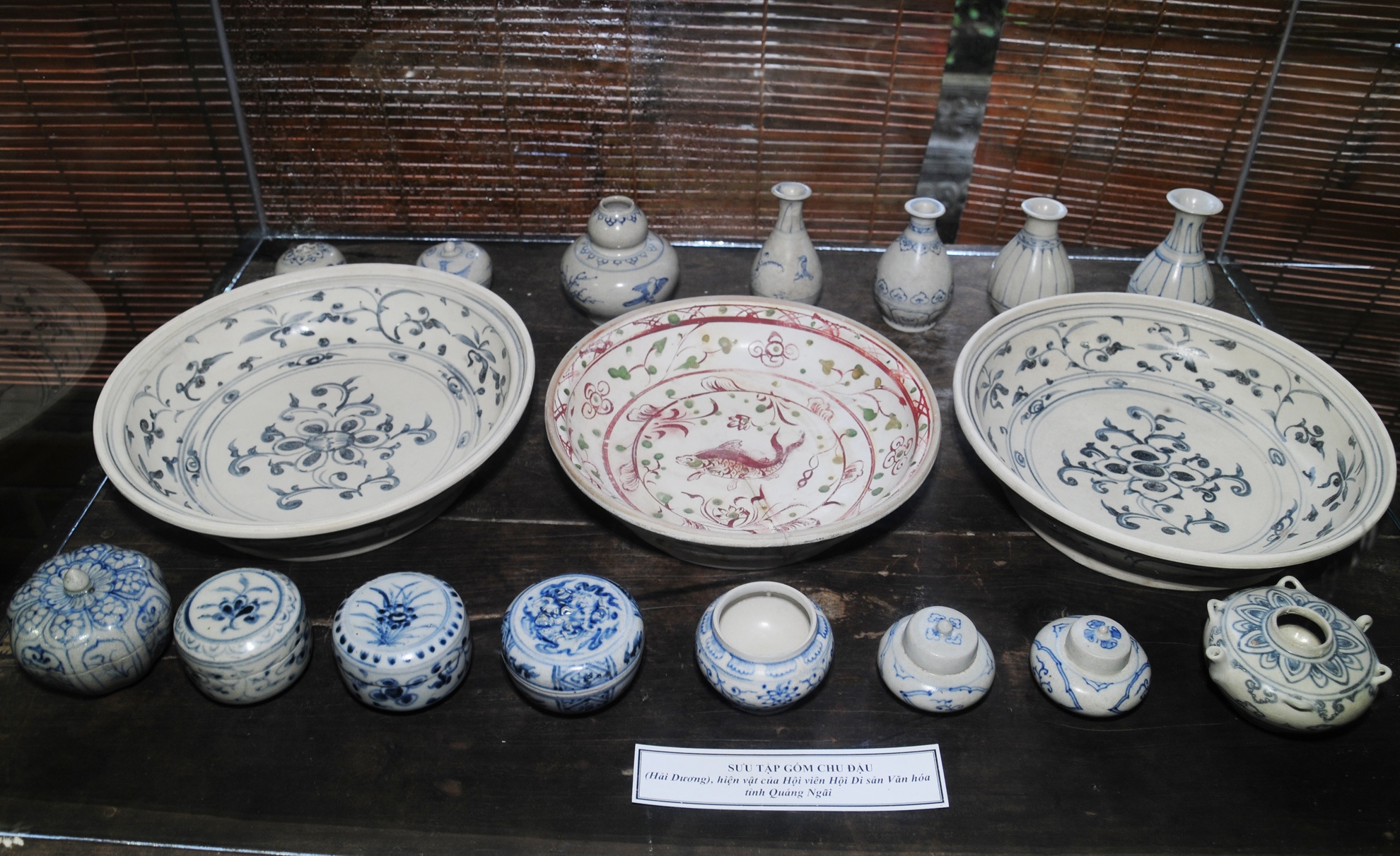 Bộ sưu tập dĩa, bình, lọ gốm Chu Đậu (niên đại thế kỷ 15) tìm thấy ở vùng biển Cù Lao Chàm. Hơn 500 cổ vật liên quan đến chủ đề biển đảo được trưng bày trong nhà rường truyền thống đặc trưng của dân tộc Việt Nam lần này là kết quả bước đầu của chủ trương xã hội hóa sân vườn bảo tàng của tỉnh.
