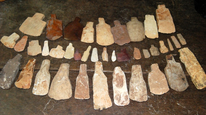 | Một số công cụ đá với đủ hình dạng, kích cỡ, được làm từ nhiều loại đá khác nhau. |