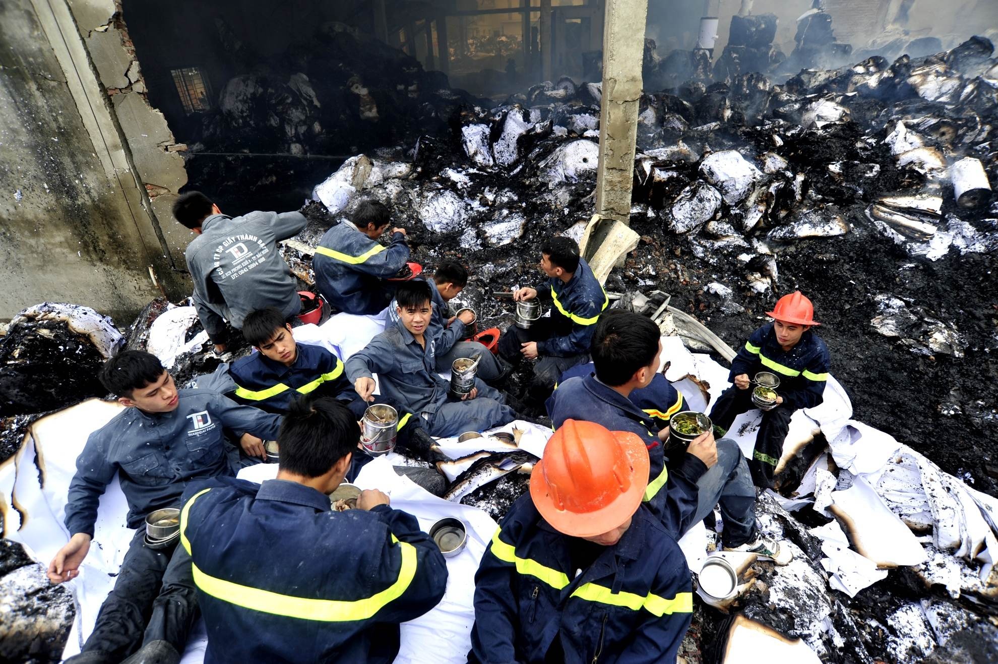 Bữa ăn dã chiến của chiến sĩ thuộc lực lượng cảnh sát PCCC huyện Gia Lâm (Hà Nội) và thành phố Bắc Ninh. Hai đơn vị này đã huy động hơn 100 chiến sĩ tham gia dập lửa. Đến 15h30 chiều 5/5, đám cháy vẫn âm ỉ trong khu vực giữa nhà kho nên công tác khám nghiệm hiện trường chưa được tiến hành. Dự kiến, đến tối đám cháy mới có thể được dập tắt hoàn toàn.