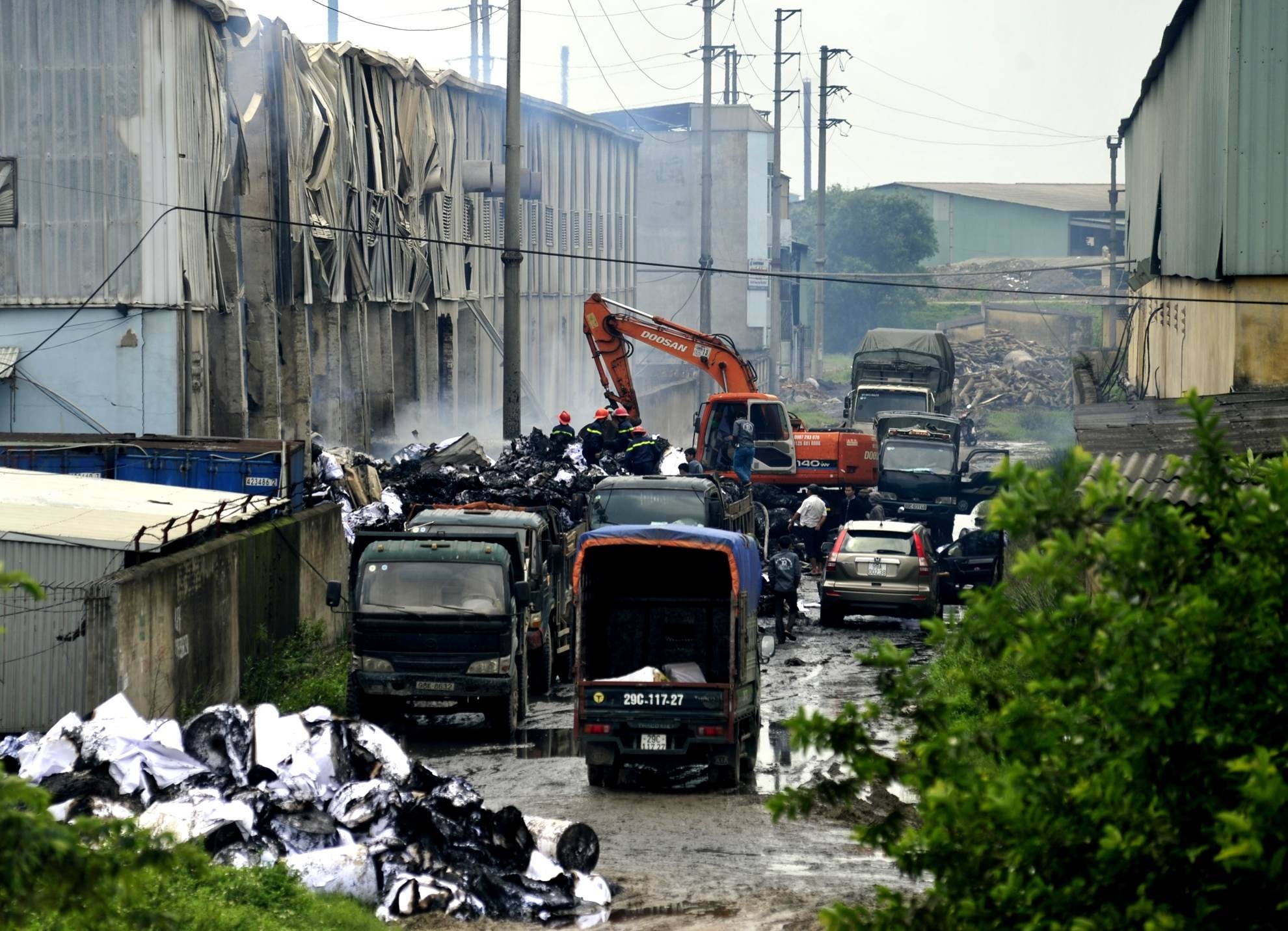 | 7h sáng 5/5, vụ hỏa hoạn tại nhà xưởng của Công ty Thành Đạt (khu công nghiệp Phong Khê, Bắc Ninh) đã cơ bản được phong tỏa. |