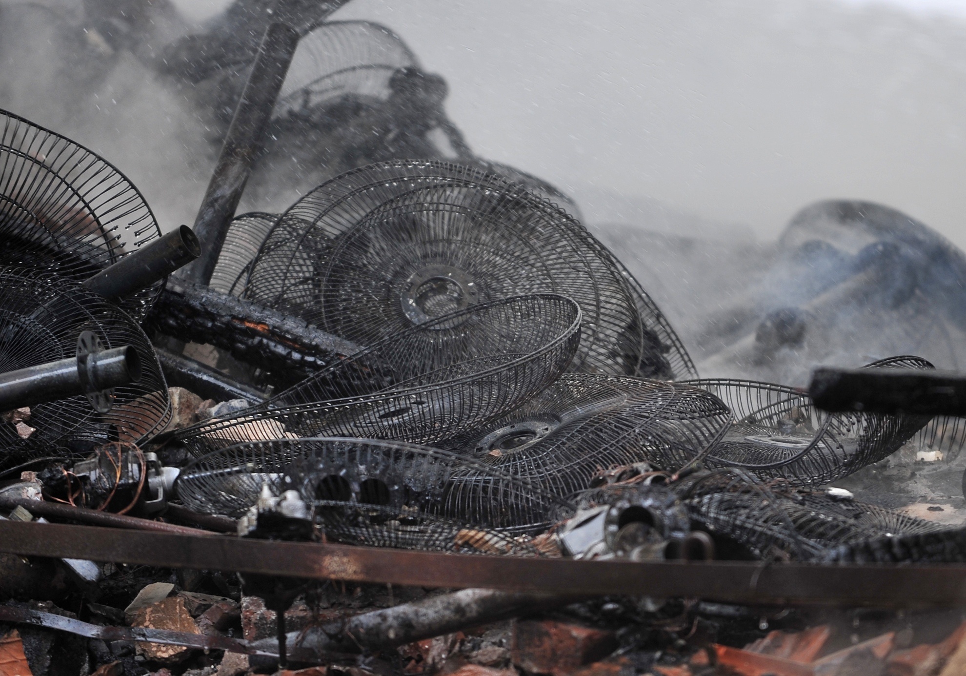 | Gạch ngói rơi cùng nhiều chiếc quạt bị cháy rụi trong kho. |