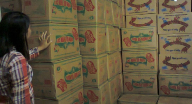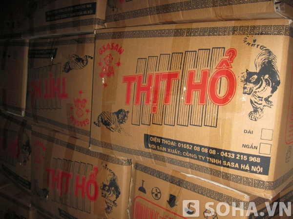 Khi chúng tôi nói cần tìm mua sản phẩm “sườn bò thơm cay” thì nhân viên cho biết sản phẩm này “bán rất chạy” và “giá cả cũng phải chăng” rồi đưa chúng tôi vào khu vực góc nhà kho để xem hàng. Tại đây, hàng trăm thùng các-tông được xếp chồng lên nhau, bên ngoài ghi các nhãn như “thịt bò”, “sườn bò thơm cay”, “thịt hổ” với những hình vẽ minh họa lòe loẹt…