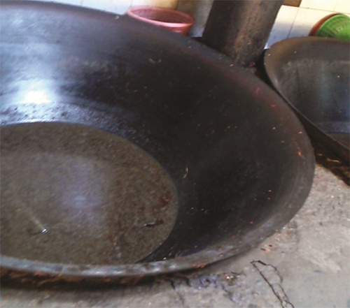 Mặc dù vừa luộc thịt xong, nhưng hai cái chảo này chứa một thứ nước đặc quánh màu đen. Phía ngoài sân, nhiều can nhựa chứa chất màu đỏ, theo giải thích của một công nhân là nước gia vị đã sử dụng xong, chuẩn bị mang đi đổ.