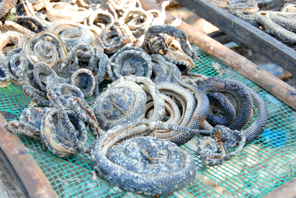 | Rắn làm khô thường là các loại bông súng, rắn râu, rắn nước, rắn trun…. vì đây là loại rẻ tiền. Rắn bắt về sẽ được cắt tiết, lột hết phần da, loại bỏ phần xương, sau đó tẩm ướp gia vị. |