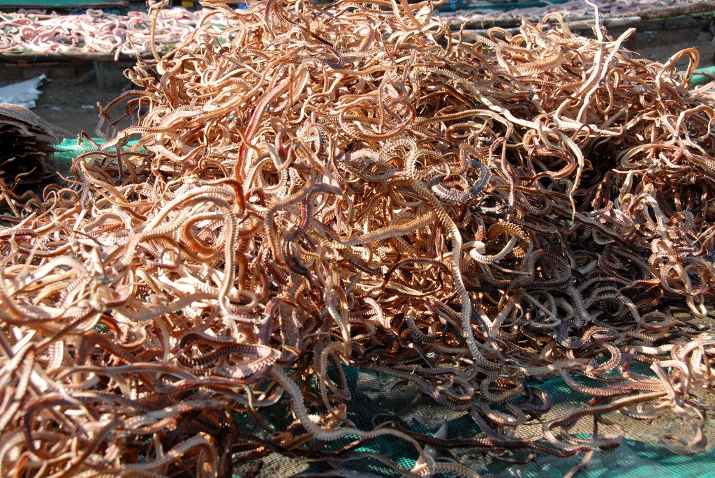 | Người làm khô rắn cho biết, sau khi lấy thịt làm khô, tất cả các bộ phận đều có thể tận dụng. Như da và đầu rắn bán cho các hộ nuôi cá, ruột bán cho dân nhậu. Đặc biệt xương rắn phơi khô bán giá 30.000 đồng/kg cho các lò nấu cao. |