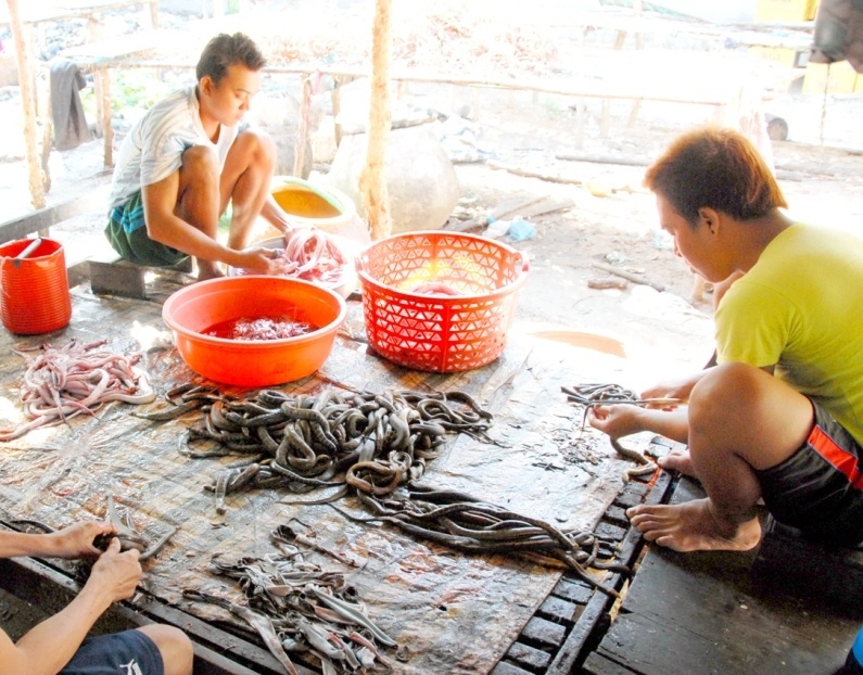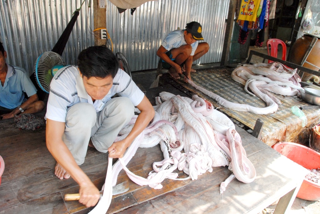 Anh Lê Văn Tiểu, người chuyên làm khô rắn ở xã Vĩnh Hội Đông, cho biết thường vào mùa nước nổi rắn nhiều vô số kể. Không chỉ cư dân vùng biên theo nhau săn rắn nội đồng, mà người dân Campuchia cũng mang rắn sang Việt Nam bán cho các chủ vựa. Bình quân mỗi ngày cơ sở của anh Tiểu sản xuất khoảng 20 - 25 kg khô rắn.