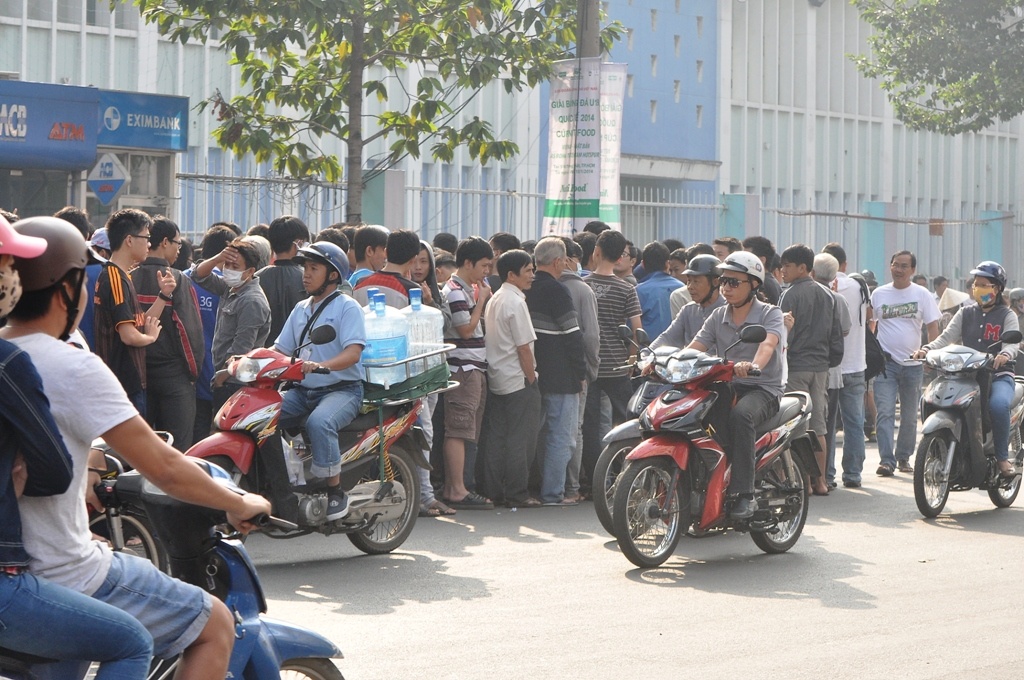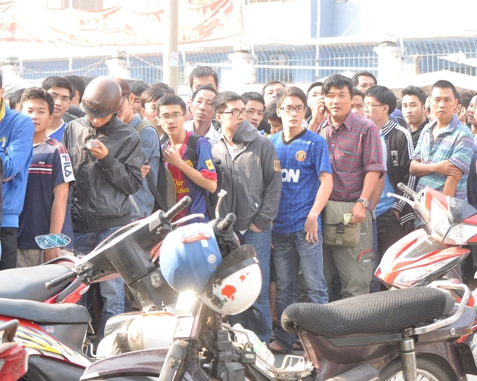 | 9h sáng nay 28/12, BTC mới tổ chức bán vé đợt 2 tại các khán đài C, D, A4 nhưng từ 7h sáng đã có hàng trăm khán giải chầu chực trước cửa sân Thống Nhất chờ mua vé. |