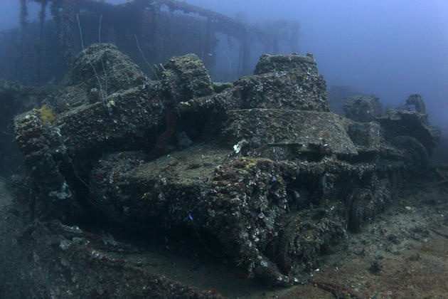 Loại xe tăng hạng nhẹ Type 95 nằm chất chồng trên xác tàu vận tải Nippo Maru. |