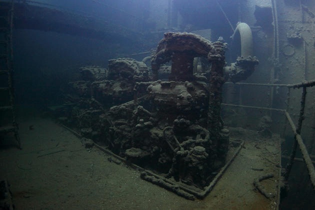 Động cơ của tàu vận tải Kensho Maru rỉ sét do ngâm mình dưới biển. |