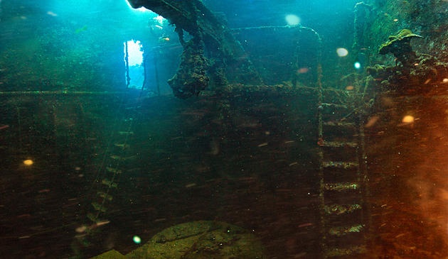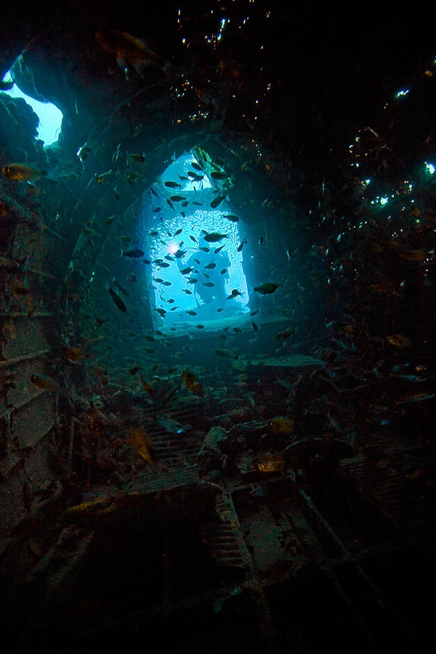 Cá bơi trong khoang một chiếc máy bay ném bom Mitsubishi G4M “Betty”. Những mảnh kim loại hoen rỉ là nơi sinh sống lý tưởng của san hô hoặc các loài thực vật biển. Chúng kéo những con cá tới sinh sống. |